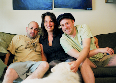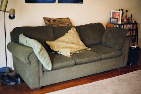 Couch #12 belongs to Jess and Ben. Jess got the couch in Chicago at Marshall Fields during a huge sale. This couch was discounted because it was missing a pillow and had a rip on the side. It was originally probably $1000 and she got it for around $200-$300. When the doors open for these sales, a sea of people flow in. She had to run in and plant her ass on it to claim it while her friend or family member went and paid for it, It is a sleeper and it weighs a ton. Last time they had to have the ex-Marine who lived next door help move it. It is comfortable, but it does need a new mattress. There is a sag in the middle. They have slept on it as a sofa and as a couch. Ben and Jess live in an apartment in Historic Filipinotown. They don’t live in Beverly Hills. They live in “the ‘hood”. It’s also a Hispanic family neighborhood. There is violence, but there are also kids. They have lived in these sorts of neighborhoods much of their lives. Jess is a freelance vocalist. Ben works in digital asset management for a major studio and is also a musician. They are married and have been for nearly two years. Jess and Ben have a dog, Orson. He is an integral member of their family. Actually, he is the star. Jess likes to play music and is learning bass right now. She also likes to go hiking and spend time with Orson outdoors. She enjoys listening to music and going to the movies. She is a closeted artist too. She draws in her notebook. Ben plays music alot. Mostly Jazz. He is a bass player. He reads vintage science fiction among other things. Ben spends time with Jess and Orson and shops at thrift stores and book stores. Jess is possessed by Art the Clown when she is serious about some art she is working on. He turns up in her work quite often. Art kind of looks like Bozo. Jess believes that he is telling her she is taking things too seriously. Art the Clown has a myspace page. Ben was a punk ass son-of-a-bitch when he was younger. He was a smoker and hung out with scuzzy people on the fringes of society. He had an edginess and a chip on his shoulder. Ben was pretty angry back then. Ben is also somewhat of a compulsive personality and collects things including a bulk lot of purportedly 20,000 ties. Ben was wearing one during the interview. Ben and I worked at MGM together. He was my coordinator for a short time before I got a full-time coordinator. Jess believes she met me at party hosted by our friend Marlene. I recall meeting her at Zen Sushi when their band Chicken Fat was playing. Ben has been to 2 out of 3 of my art shows, but that is all Jess’ doing. She likes supporting her friends and appreciates the hard work of creative labor. Some of Ben’s favorite songs are “Time” by Richard Hell and the Voidoids, “Good Pair of Hands” by the Country Teasers, and “Waters of March” by Tom Jobim. Jess likes “Horse with a Frieze” by Eddie Bo, and “Show It” by Betty Harris. Ben enjoys pizza and Jess likes spaghetti squash. Ben likes the film “Never Too Young to Die” featuring John Stamos and Gene Simmons. Jess likes “Night of the Hunter”. Jess is really excited to see how this project unfolds. Will there be an iconic image from each couch? How will I whittle things down? Ben wants to know if I will reveal statistics at the end, like how many people I had sex with. Will I release a commemorative glass cup? Who will write the academic introduction for my Taschen book? And who will be the artists who’s work will be used to represent the work of Dean MacKay? They do have guests periodically and have an open door policy. They would let me stay there any night, so I may be back.