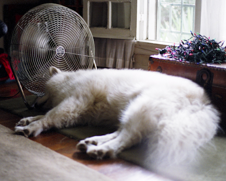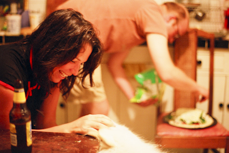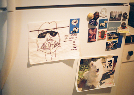 Once I was done, I made my way to the couch. Now, I’ll have to say that alot of this evening was a blur after that. I obviously wasn’t feeling well and therefore didn’t take very good notes about what was discussed or what we did. I do remember that Ben was making home made pizza that I couldn’t even think of eating. There was also beer in the fridge that I couldn’t think of drinking. And I do remember making several more trips to the rest room. This included one trip to throw up the carrots I had decided that I could eat. It was a brilliant orange color that made me laugh in my misery. After that I stuck to eating a banana and some pita bread. I also napped on the couch at one point for about an hour and the high powered fan that they have to keep their dog Orson cool also kept me cool. I do remember Jess and Ben discussing what the fall television schedule would be if it were entirely based on their refrigerator decorations. I don’t remember the details of the shows, but there was a discussion of a remake of “The Incredible Two-Headed Transplant” feature Nelson Mandela and Macaulay Culkin. Or was it “The Man with Two Heads”? I’m not sure. We sat in the kitchen and later, the living room. Time passed quickly and before I knew it was time for me to sleep.