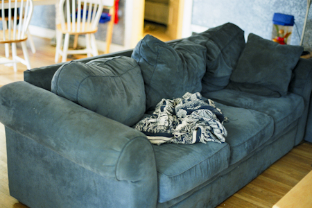Couch #16 is Scott and Torun’s couch.  It came from Levitz back in 2003 when they bought the house. Torun went all over town looking for this sofa set. She pretty much falls asleep on every night.  It’s not quite long enough for Scott to sleep on it.  It doesn’t show stains really.  The dog, Cooper, wasn’t allowed on the couch until recently.  Scott has gotten soft and allows the dog up there now.  They live in in single family home that they own and have lived in for about 7 years.  It is in El Sereno or Hillside Village, in the northeast corner of Los Angeles.  Scott and Torun have been happily married for nine years. They have two daughters, Kayla, age 10, and Brady, age 5.  They have a baby boy on the way.  Cooper is their golden retriever who is a little over a year old.  Two weeks ago, his pit bull, Mary, had to be put down. It was really hard.  In addition, they have a cat, Fluffy, and some fish.  Torun is a nurse and LVN (or LPN) in a Convalescent Hospital.  Scott helps to fill studio audiences.  As a family, they like to go camping as well as to the beach and bike riding.  They like outdoor activities. There is no time for hobbies, only laundry and dishes.  Scott is a musician.  He plays guitar in a metal band, categorized as death or grindcore.  You may guess that given his long hair and tattoos.   But you might be surprised that he is a devoted Dad.  Scott and I met through friends probably around ten years ago mostly due the fact that we are both from the same part of the world.  We are fans of the Red Sox and Patriots and have attended baseball games and football games.  We have drank a few beers and broken bread many times together.  Torun likes Bon Jovi.  Scott likes classic rock and aggressive metal.  He likes Led Zeppelin’s “Kashmir”.  Scott and Torun BBQ alot and eat pretty well.  When you have kids, you eat what they eat best.  They like Italian Food.  Scott particularly likes chicken parmesean.  Torun likes Mexican food.  Torun is great cook.  She is a baker and makes deserts, pastries, and cakes. Scott does more day to day cooking, but Torun makes the holiday meals like the big turkey dinner, all the sides, sweet potatoes, stuffing, mashed potatoes, and gravy.  One time when they were having a big dinner party,  there was so much hot stuff on a glass table that they had, that the table cracked, and broke.   They don’t watch a lot of movies. Torun likes to read. “Change of Heart” by Judy Picoult is a favorite that she read a few times.  Scott lives surrounded by love from family and friends.  His lives for his kids and family.  Torun lives with the baby, being pregnant and all.  It’s kind of strange.  In 11 weeks their son is going to be out here and crying.  This was the 8th completely different couch in a row.  This project has attracted a diverse group offering me their couches.