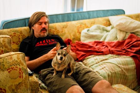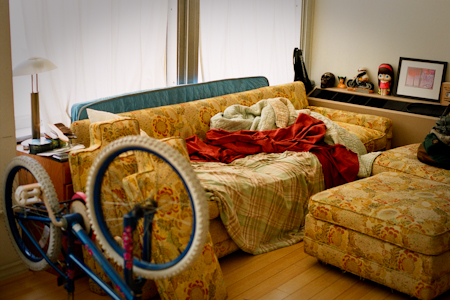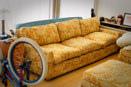 Couch #19 belongs to Greg. Or more specically, to his girlfriend, Nicole and him. They live in the Bartlett Building, in a converted loft that Nicole owns, in the Historic Core of Downtown Los Angeles, California. They live their with their chihuahua, Princess. Nicole and he have a group of friends, called Tren Way Bicycle Gang. One of the members of the group had the couch in their office on Magnolia in Burbank. He had a little IT business there. They used to have after hours parties there and Nicole absolutely loved the couch. Initially another friend took the couch for a while, but then wanted to get rid of it. Nicole and Greg were moving into the loft and arranged to pick up the couch. It was 4 sections long and was too large to be moved into their place. Nicole and two friends just couldn’t get it around the tight corners of the old downtown building. Once they had tried everything, Nicole then hired two guys she found on Craigslist who struggled for 3-4 hours with it. They were able to get it up the stairway to the fifth floor, but were not able to get it down the narrow hallway to the loft. Once they had done all that they could Nicole then contacted friends who had had some reupholstery done recently for some advice. The people that had done the reupholstery work took the couch then proceed to chop off and remove one of the sections and reattach the arm. It was now a smaller, 3 section couch, and was able to be moved into Nicole and Greg’s place. As you can see, it has a lot history among their friends. And it is definitely comfortable to lie on. Greg is employed doing IT work at NBC TV Stations in Burbank. Greg and Nicole like riding bikes and camping, and they are into photography and music. Greg is just getting into playing music. They also like seeing bands and watching movies. Opposite of where he is at now, which is being environmental and green and riding bicyles, Greg raced motorcycles as a kid, off-road, in the desert. He was really good at it and successful. Greg then went off to college and gave it up. It’s kind of dangerous. Bicycles are alot cheaper and safer.
