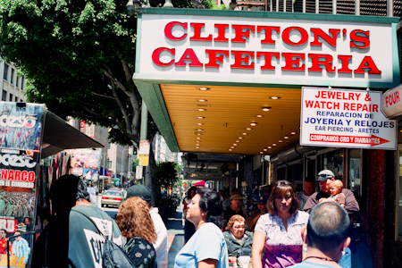 I decided to take a moment and wander around the neighborhood taking some street photography shots. Most of these were taken with my digital at my hip and aimed in the general direction of the subject. Other than the woman in a clown outfit, I didn’t get anything fantastic. Well, except for a “What are you looking at?” from some crazy lady on the street. I did take some photos of the Los Angeles Theatre, Clifton’s Cafeteria, and some graffiti art as well, before making my way to my car and off to the YMCA for a much needed shower. I had to get myself cleaned up and together before making my way to Fullerton, behind the Orange Curtain, and my next couch.