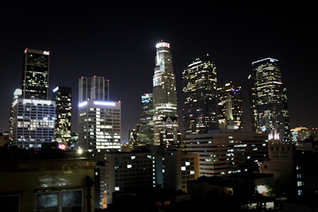 We ate our dinner, which was quite. I’m not necessarily a fan of the non-meat sausage but in this case it was fine. The squash was a summer squash of some sort and was delicious. But then again, I am a fan of squash. I’m not exactly sure what kind of squash it was. It was a yellow squash or a zucchini or even a spaghetti squash. It was a different form than the yellow squash, but tasted quite similar. Again, I definitely enjoyed it. After dinner, with another beer in hand, we headed up to roof. The roof was one of the great things about living in this building and so it was a must stop for my visit. And it was impressive. It was nice night out, so I welcomed the time outside, but it was really more about the view. From Greg’s roof, the skyline of Los Angeles was right in your face. It really was quite incredible. This would be yet another night that I would have a view of this city that I call home. We stayed up there for a while talking some more and I took in all angles. In addition to the skyline, we noticed that on one of the roof there was a gathering going on, but more interestingly, while investigating that, I noticed that you could see into many of the people’s homes in that building and the voyeur in me scoured the windows which had their lights on for any signs of life. I remember there being one woman at home on her computer by the window. She sat staring at that screen motionless for so long that at one point I was sure it was mannequin. Then she would type or move to reveal that she was, indeed, alive.