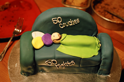 It was at this moment that I truly realized that my fear of being at a party was unfounded. You see, most nights, I showed up to my host’s home and I was at least a major part of the attraction, if not the whole attraction. People wanted to know how I was sleeping and what was the most comfortable couch and what was the strangest experience I had had. But not on this night. While there was a cake and there were some questions, it was not about me. It was about the party. For one of the few times in my life, I relished the role of the wall flower. Not that I really was a wall flower most of the night. Most of the night I was making new friends and trying to get to know them or at least enjoy a fun time with them. We were getting drunk and talking about music and our lives. If only for a moment, things were somewhat normal in my my not very normal world. And that made me very happy and relaxed.