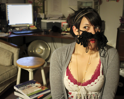 Around this time Amanda, an old friend of Shannon’s arrived. Shannon asked if I could take a photo of them. They also showed off their heels to me which they were proud and which looked quite uncomfortable to me although I was told that they were not. As well, Crystal, another Amanda, and Blossom, who are friends of Andy, the roommate, arrived. Blossom had her dog Yoda, a chihuahua, in tow as well. I sat down with the people from Neighborhood Watch, answered a few questions about the project and was even given an Arco gas card with $10 on it. It was yet another gesture that made me a bit emotional. The yarn moustache made another appearance, I sat on floor and played with Yoda, and Shannon went back to playing music off the computer. She introduced me to El Ten Eleven. While I don’t recall which song she played, I do recall really liking it. And so now, every once in a while, I just search for it on YouTube and play whatever comes up. It always makes me smile. I, in turn, played Restavrant, for her. I believe that she enjoyed it.