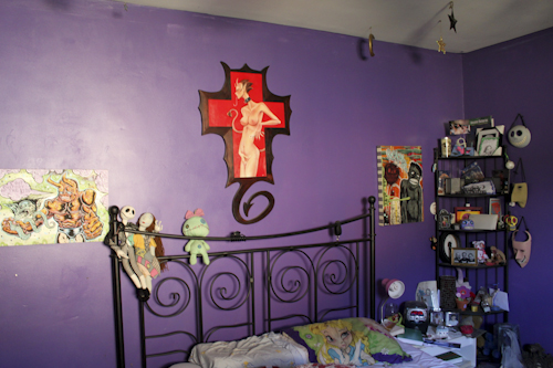 Shannon lives at her desk. It shows everything that she worked for. There’s a Jabbejaw poster. She used to go to Jabberjaw all the time in the ‘90’s. The first time she went there was the day after the riots for a Godflesh show. Shit was still burning. It’s on Pico and it was pretty scary. They had amazing posters. The poster is one of her prized possessions. She loves Unsane too. The poster is awesome. Also at her desk is all of her certificates, including the one for Rolfing. There is also memorabilia from her travels including her recent trip to Boston, photos of her and her daughter, as well as quartz and other stones for doing facials. Her computer is there and she is often sitting there on Facebook and Pandora and YouTube. Also, there is a Jesus Lizard poster, because David Yow is her hero and the poster artist is amazing too. She also has lots of affirmations taped on the wall and a Suicidal Tendencies pink baseball hat that she got at the ST tattoo shop before it closed. She also has a cool Rat Fink Hat that she found at the GWAR show. There is also a Robert Crumb picture up on the wall as well as a Niagara poster that her daughter used to say “That’s You Mommy”. It says “If I Want Your Opinion, I’ll Beat It Out of You”. That’s where she lives. Awesome.