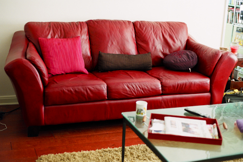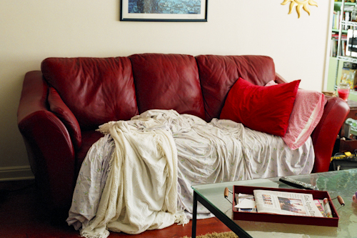 The couch is from Levitz in Burbank. Before this couch Maura had a couch named “Purple Love” It was a plum, 9 foot, camel-backed, sleeper sofa and Maura loved it. It had to be moved in and out through her window and even that wasn’t easy. I believe it even involved the wall having to be cut into to get into the apartment. The current couch was able to fit through the door. Maura was doing okay financially at the time when she bought it, but could only afford to buy once piece of furniture at a time. At this point in her life she wanted to replace all of her IKEA furniture because she wanted to be a grown up. So, first, she bought this new red leather sofa. There was also a love seat and a chair that went with it and ideally that’s what she wanted to get. But then Levitz announced that they were going out of business. Maura then went back, but buy this point the had discontinued the rest of the set. Instead, she bought a love seat and chair that are chocolate in color. They don’t necessarily match, but they do blend well. She’s actually really glad that she got them, because if she had the all red set, it might look a little more “boudoir” in the living room than she would have liked. She loves the couch though. It is comfortable and it did pass the nap test. Maura doesn’t buy a couch unless she can lay on it and actually fall asleep in the store. If napping was an Olympic sport, Maura would totally medal. She is the Queen of napping.