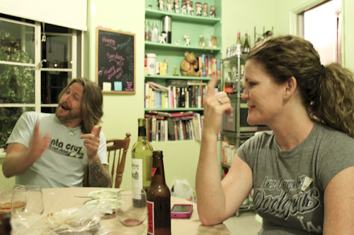 Maura escaped to have a smoke outside and the conversation continued. Mishi talked about working for Forrest Ackerman as a caretaker at the “AckerMansion” and living in the “The Cabinet of Dr. Caligari” room. She also told the story of how she brought in a pink couch and after intially wanting to get rid of it, she was convinced to put it in the Bela Lugosi/Boris Karloff room. It, of course, stood out, but that was the point and the joke. Rick and I also talked about owning Volkswagens. He’s always hadVW Beetles. With his recent move, the one that he currently had was being stored in a friend’s garage. The talk of beetles let to that of bugs, junebugs specifically, which made themselves known that evening. We talked about Ireland and the violence that had happened years ago. Maura is Irish-American and still has family there. She was planning a trip for Christmas. We talked about the movie “Religulous” by Bill Maher. “Toy Story III” was also discussed in this conversation. We spoke of first dates. Maura has a quite a few stories about bad first dates. One of those featured her date meeting her at the Dodger game and showing up drunk. Rick was her wingman for the night and they decided it was best to ditch the guy. However, when they did, the guy took off with Maura’s jacket. And that’s just one story. The Hootenanny was also brought up. The Hootenanny is annual music festival/car show of sorts that takes place in Orange County. In 2010 the headliners were Chuck Berry and Jerry Lee Lewis. I’ve never been, but every year it looks interesting. Perhaps Rick had been thinking about going there, but I don’t recall. By the time I had reached this portion of the schedule, I was pretty drunk. I had tried to keep up with Rick while downing my beers and sipping my bourbon. The handwriting on my notes is sloppy and my memory even sloppier. I do remember Maura painting her finger and toe nails but not much more. The conversation was good, the drinks went down easily, and the food was delicious. Before I knew it Maura was packing up the leftovers for Rick and both he and Mishi headed out. Maura finished up getting ready for bed and I followed suit. The TV went on for a little bit and we watched a bit of Family Guy before I then turned on Sportscenter for a few minutes. With the bed made and my teeth brushed, I fell asleep just about the moment my head hit the pillow at 1130pm. With all the booze in my system, some warm and fuzzy blankets, I slept so well.