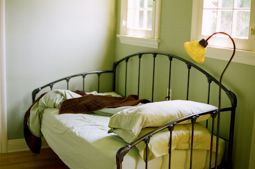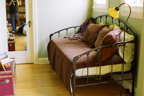 Once breakfast was done, Rebecca noted that she had to leave for work shortly. She had a meeting or a conference call or something, so if I wanted to get portrait photos of her, now was the time. I asked for a few more minutes and ran upstairs to capture photos of the couch as a bed. I snapped away quickly, made the bed up, and David and Rebecca sat down and posed. I worked quickly, capturing all the angles that I could think of using both my digital and film cameras. Rebecca then said her goodbyes and I thanked her for everything.