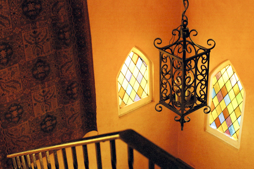 Rebecca had finished cleaning up and gave me the quick tour and showed me the room where the daybed was. She told me how some of the walls were made of marble . Rebecca confirmed that I was parked in a good spot and didn’t a parking pass. I didn’t. She also confirmed that I could drive to Van Nuys that night. Of course I could. Rebecca excused herself to get ready. I moved my stuff up into the room and took some photos around the house. Again, the place was amazing and while the lighting was less than ideal, I couldn’t wait until the next day to take all the photos. In addition to the stained glass windows and the incredible doors, their were also interesting lighting fixtures and tapestries on the wall. The chairs and table in the living were intricately carved wood. And then I wandered outside . I stood there and stared at the almost-full moon and enjoyed the peace and quiet and cool evening air for a few moments. It felt good.