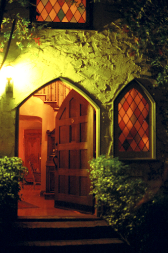 After a bit of driving up and down and back and forth around the neighborhood, I found a spot not too far away where I could leave my car indefinitely. I loaded myself up with all of my things and made my way to David’s home. I walked through the gate into his yard and was in awe. The house was like a castle or maybe a church. It was stone with vines and ivy and glorious stained glass windows. The door itself was magnificent. It put a smile on my face. I looked while I walked to the door. As I was already late, I didn’t want to linger too long in the yard.