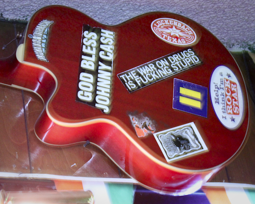It was loud in there and so conversation would be minimal the rest of the night. I cozied up to the bar and go myself a Newcastle. I remember money being especially tight so I would be nursing my beers throughout the night. It was also the first time in a week that I had been in a bar. And who knows how long it had been since I had seen live music. While that’s not unusual to me now, it was unusual to me then. I went out quite often and enjoyed seeing live music. Missing that and not knowing when I would do it again, I wandered around the bar and soaked the atmosphere in. I also wanted to check out the place and take photos of anything interesting. In addition to way too many blurry photos of David and Rebecca and anyone they were talking to, I also took shots of the bar, some signs, and a guitar that hung on the wall. The guitar had a bumper sticker on it that read “God Bless Johnny Cash”. As I’ve mentioned before Johnny Cash was originally supposed to to be a theme of this journey and so whenever there was a visual reference to him, I made sure to take a photo. And again, it made me smile.