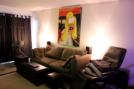 Couch #17 belongs to Brian. He got the couch for $50 from a company he worked for called Intertainer when they were closing back 7 or 8 years ago. Brian is Guitarzan. Therefore he lives in Guitarzan’s lair in Hollywood. Brian is single and has no children that he is aware of. Brian does a lot of things. He works for Sprint in the mobile pre-paid division. Mobile marketing, content ingestion, metadata, and service operations are all part of his job. He does the dirty work. Music is a way of life to him. Brian also likes hanging out with his friends and loves watching movies. He programs remote controls for rich people on the weekends, which is actually fun. He loves messing with home theatre electronics and computers any kind of gear, you know, boy’s toys. Brian is kind of shy, especially with strangers, but once he gets to know you he’s pretty good. It seems like we have always known each other. Neither of us remember quite when we met. It’s been about 10 years. Brian likes Muse, Van Halen, Jimi Hendrix, and The Who among other things. He likes a great guitar player and a catchy little melody. A favorite song might be “Eruption” from Van Halen. Brian really likes pizza, but he can’t have it, ‘cause it makes him fat. He especially likes pizza from Massey’s in Ohio, which he orders once a year for Super Bowl. A favorite film of Brian’s is “Spinal Tap”. He could watch it a million times and never get sick of it. Brian lives in musicland. His parents met in college and were music majors. He thinks about music all the time. He moved out here chasing his dream of being a professional musician. It’s been a great ride. Brian still plays all the time. It’s part of him, like walking. Brian thinks this 50 couches project is brilliant and that it was very ballsy of me to do it. He loves that I’m doing it. It could be huge if the right people saw it. It’s a lot like some documetaries that have come out in the last few years. Brian believes that a lot of people would be interested if they knew about it.