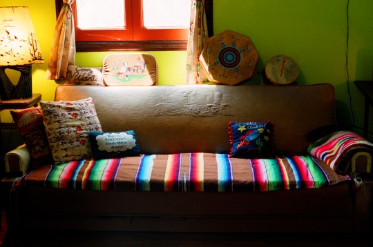 Couch #3 belongs to Julia. The Cowboy Couch was found at Goodwill, who thought it was broken. It cost $19.99 plus $10 to have it moved. Julia lives in a house in Glendale, California with her son, Jack, age 6, and the Sophia Loren of bulldogs, Mavis. Jack is named after Ramblin’ Jack Elliot. She is my friend, business partner, and a cosmetic brain surgeon. We met last winter on the almighty facebook and finally met in person in March. Julia has bungee jumped over 200 times. Her and Jack’s favorite song is “I’d Rather Have You” by Johnny Cash. Her favorite films include “Cinema Paradiso” and “The Singing Detective”, the original. She likes chocolate.